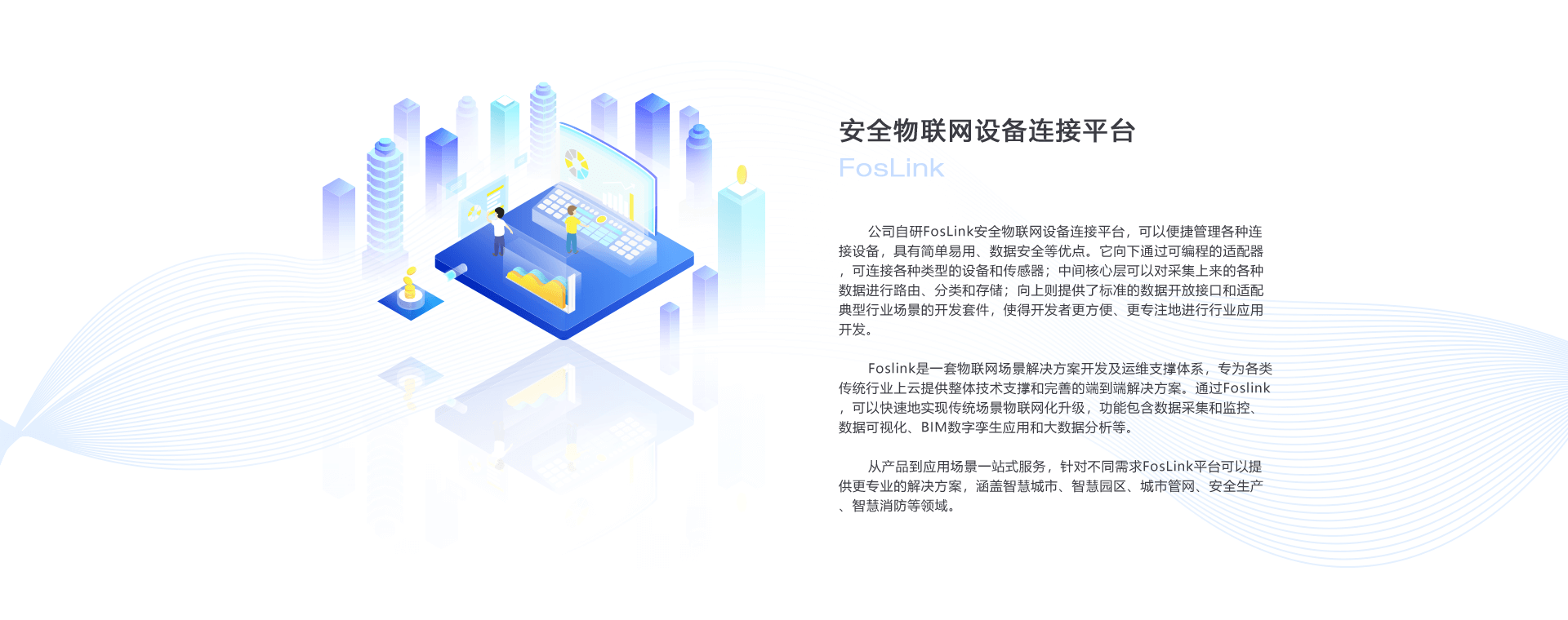 從產品到應用場景一站式服務,針對不同需求FosLink平臺可以提供更專業的解決方案,涵蓋智慧城市、智慧園區、城市管網、安全生產、智慧消防等領域。
